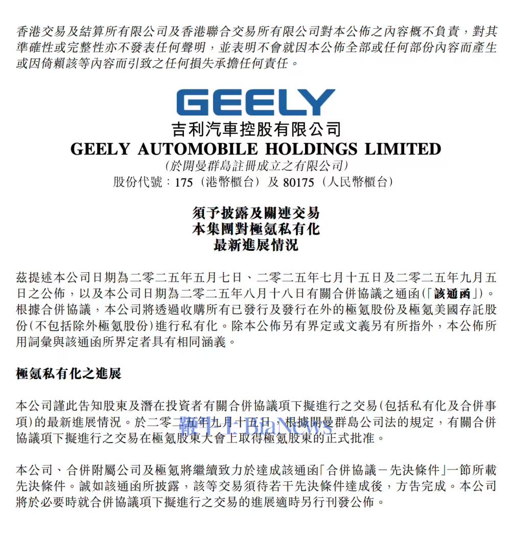 9月15日,吉利汽车在港交所公告,根据开曼群岛公司法的规定,有关合并协议项下拟进行之交易在极氪股东大会上取得极氪股东的正式批准。